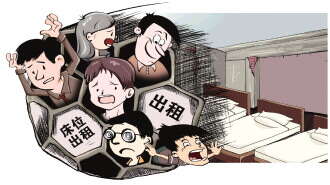 一间十几平方米的客厅里,并排摆着3张大床,床与床之间以置物架隔开,阳台上也摆着一张大约1米宽的床,除去这些,房间里仅剩下“L”形的通道供人走动,大床日租100元,阳台床位日租60元。