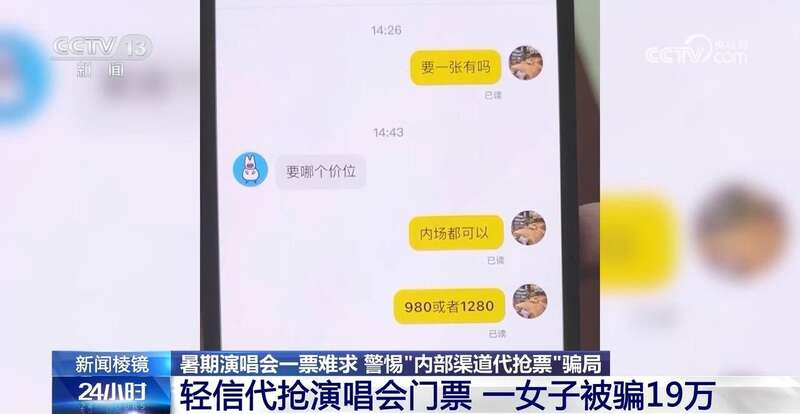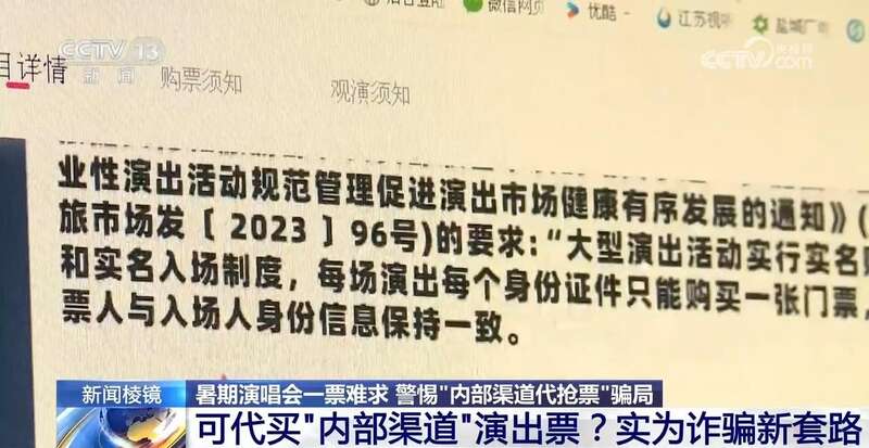 央视网消息:夏日炎炎,各类演唱会、音乐节在各地火爆上演,一些热门场次往往一票难求。这时,如果有人告诉你“有内部渠道”、“认识主办方”可以代抢票,你会心动吗?江苏的张女士就遇到的这样的情况,来看总台中国之声记者的报道。