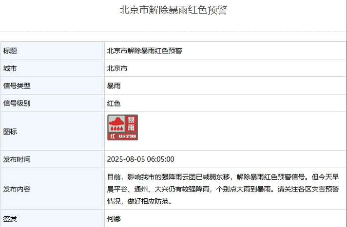 据北京市气象局消息,目前,影响北京市的强降雨云团已减弱东移,解除暴雨红色预警信号。但今天早晨,平谷、通州、大兴仍有较强降雨,个别点大雨到暴雨。请关注各区灾害预警情况,做好相应防范。
