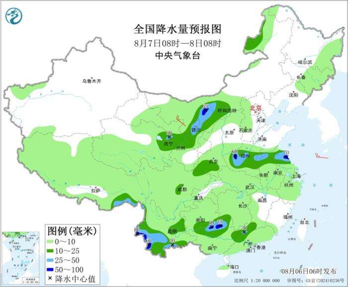 8月7日08时至8日08时,广东北部、广西北部、贵州南部、湖南南部、云南中西部、四川盆地西部、陕西南部、青海东部、甘肃中部、宁夏、内蒙古河套地区、河南中部、苏皖北部等地部分地区有中到大雨,其中,内蒙古河套地区、河南西部、江苏东部、云南西南部、广西北部等地部分地区有暴雨(50~80毫米)。