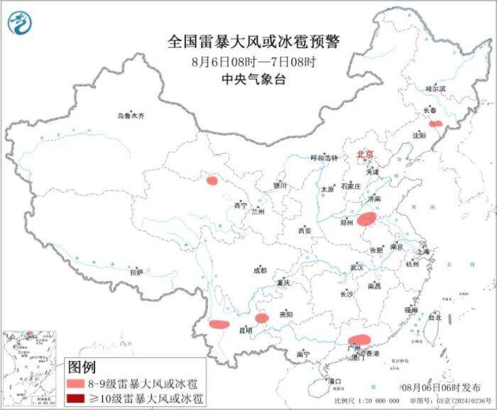 其中,8月6日08时至7日08时,广东北部和西部、广西中东部和南部沿海、湖南南部以及云南南部和西部、四川盆地西部、河南中部等地部分地区有大到暴雨,其中,广西东部、广东西北部等地部分地区有大暴雨(100~200毫米),上述部分地区伴有短时强降水(最大小时降雨量20~50毫米,局地可超过70毫米)。东北地区中部、西北地区中部、黄淮中部、西南地区南部、华南中部等地的部分地区将有8级以上雷暴大风或冰雹天气。中央气象台8月6日06时继续发布暴雨橙色预警和强对流天气蓝色预警。
