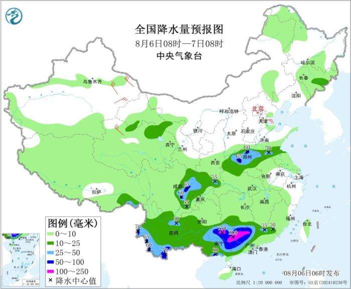8月6日08时至7日08时,广东北部和西部、广西中东部和南部沿海、湖南南部以及云南南部和西部、四川盆地西部、河南中部等地部分地区有大到暴雨,其中,广西东部、广东西北部等地部分地区有大暴雨(100~200毫米)。