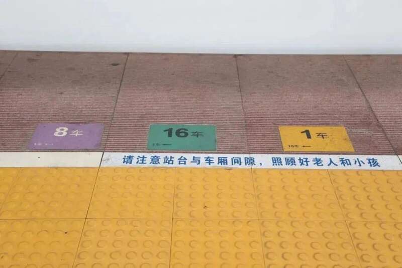 正向运行、短编组动车车厢位置标识,采用黄色或蓝色地标。