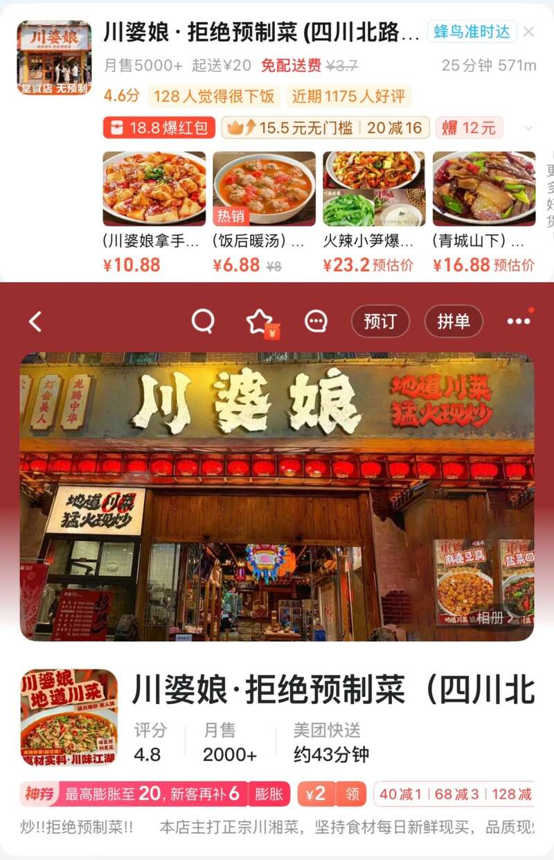 上图为“川婆娘”在外卖平台“饿了么”上的门店头像截图,下图为“美团”上的门店头像截图。