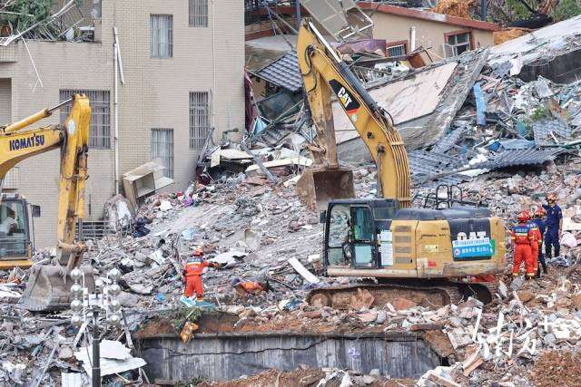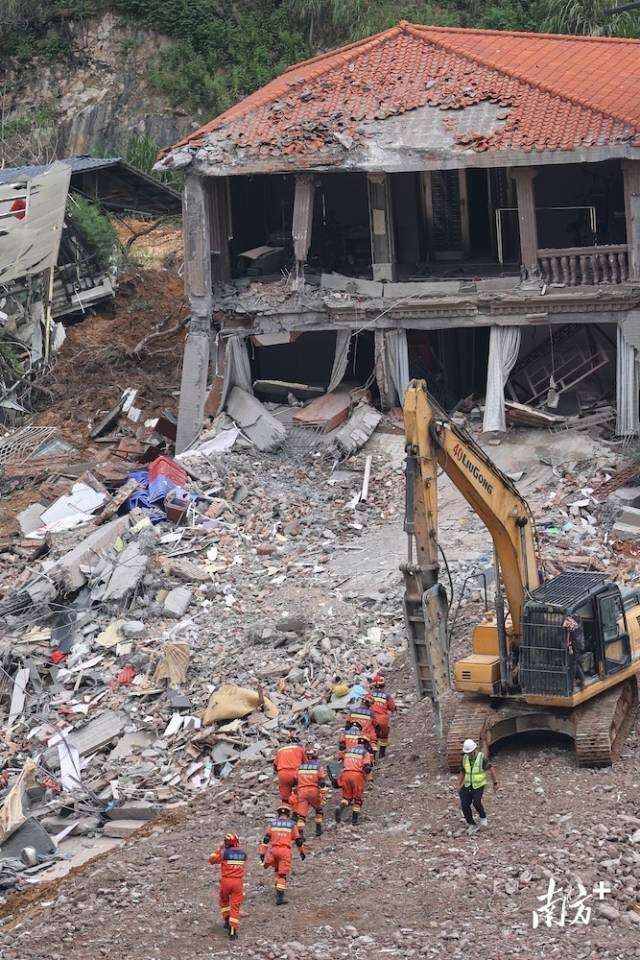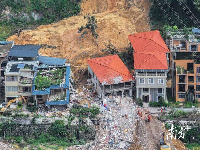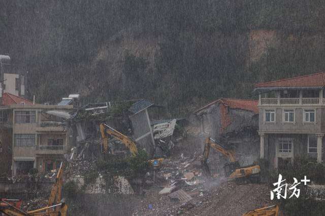 8月7日14时许,广州白云区山体滑坡现场被破除房屋的清理工作正在进行。该区域受暴雨影响,救援人员仍在雨中加紧救援。