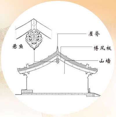 悬山和歇山是中国传统建筑中屋顶的常见样式,两种屋顶均有檩木悬挑出山墙之外。博风板是钉在檩木头上的长条木板,以保护檩木不受日晒雨淋。悬鱼的位置在博风板的正中央,可以覆盖博风板合角处接缝。