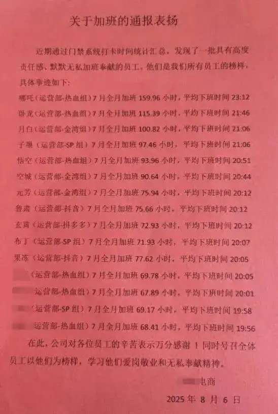 据九派新闻,近日,有网友在社交平台贴出了一则《关于加班的通报表扬》。7月表扬红名单中,榜一员工加班159.96小时,平均下班时间为23:12。单上的员工因“具有高度责任感、默默无私加班奉献”上榜。文章末尾,该电商号召全体员工以他们为榜样,学习他们爱岗敬业和无私奉献的精神。