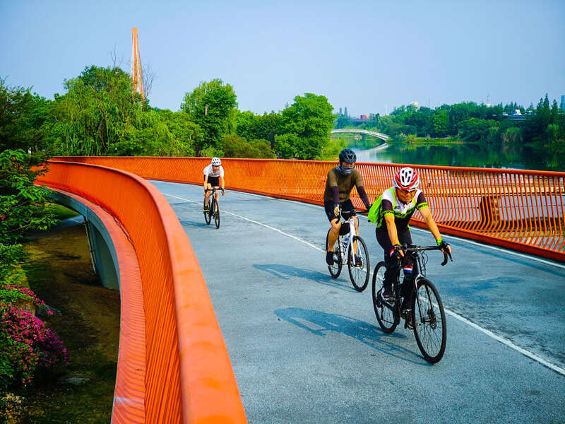 2023年6月25日,市民在四川成都锦城湖公园绿道上骑行。