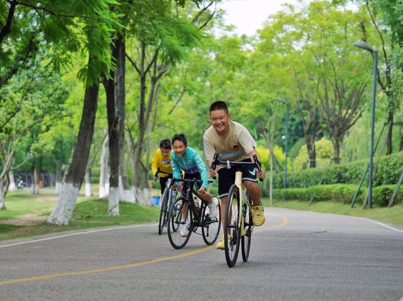 2025年8月5日,小朋友在四川成都锦城湖公园内骑行。