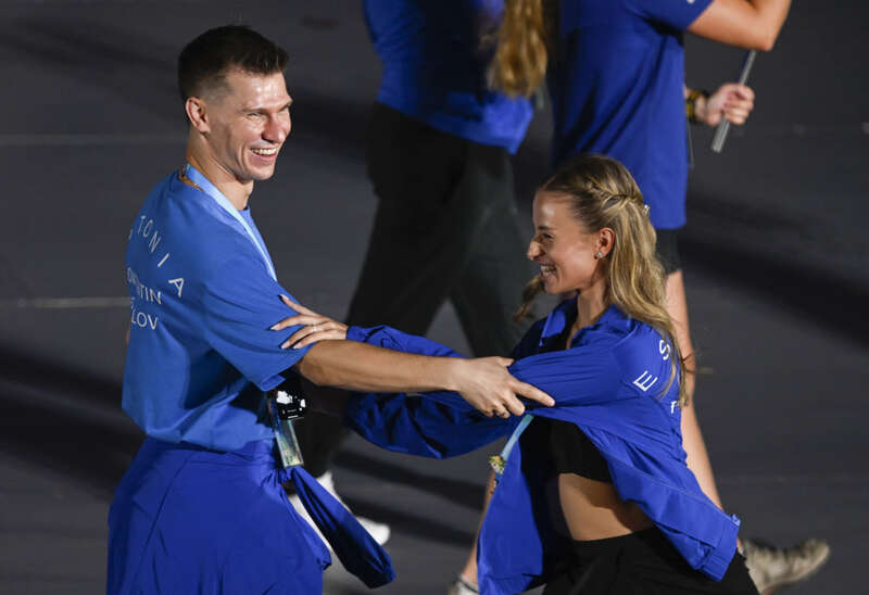 2025年8月7日,爱沙尼亚体育代表团成员在第12届世界运动会开幕式上起舞。