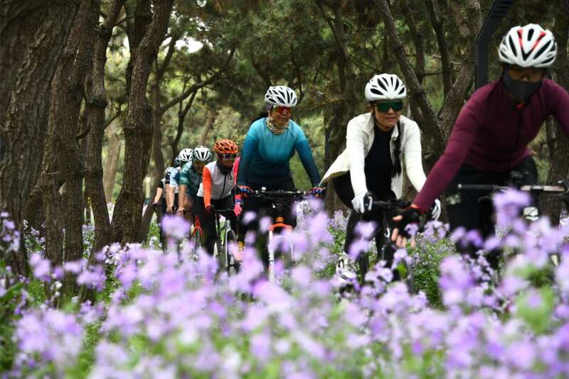 2025年4月19日,自行车运动爱好者在山东日照的海滨骑行绿道骑行。
