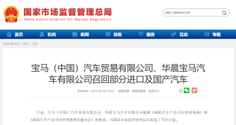 8月8日,国家市场监督管理总局网站发布消息,宝马(中国)汽车贸易有限公司、华晨宝马汽车有限公司将召回合计超23万辆的进口及国产汽车。