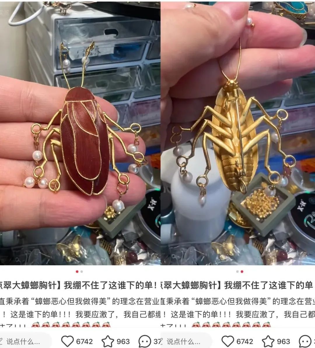 一款由90后设计的“点翠蟑螂”饰品,上线一个月就卖出两百只,如今已售罄至排队预订。消费者“订制”,无意中大卖。这只带着金属光泽、缀着翠羽的“蟑螂”,突然就成了非遗圈的“流量明星”。