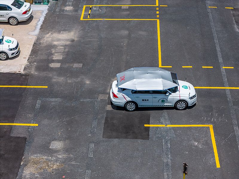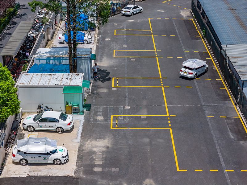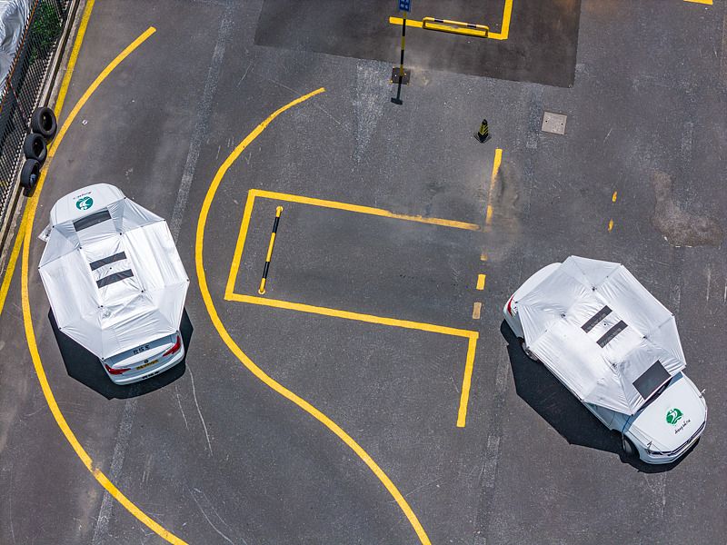 2025年8月10日,杭州,一所驾校科目二露天训练场上供学员练习的教练车,都安装了巨大的车顶遮阳伞,如同一顶大帽子戴在车上,避免太阳直射起到防晒作用,还可避免车玻璃和地面光线反射,让学员视线更清晰。