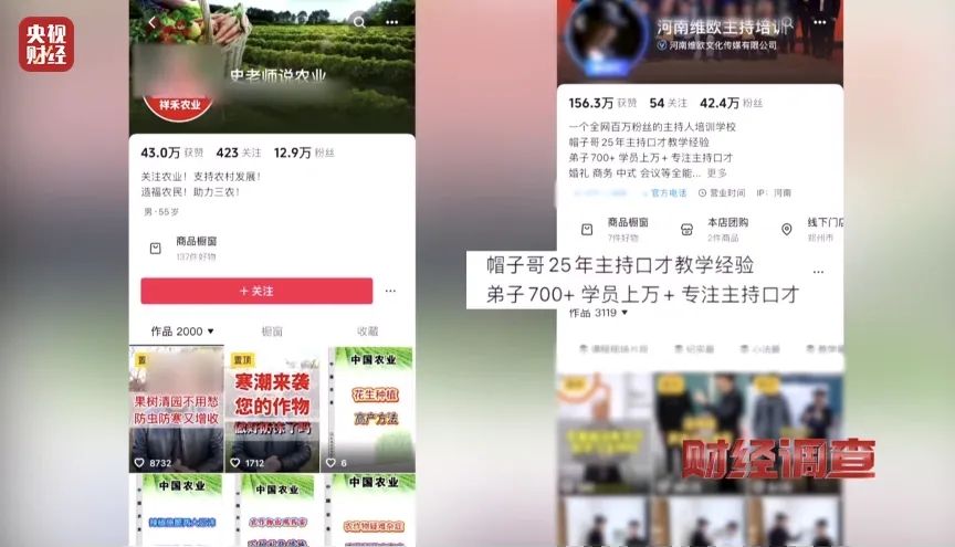 记者在各大短视频平台陆续搜索到上百个“农业专家达人”的账号,发现他们虽然身份五花八门,但是其中相当一部分账号的头像和名称上都标注着“祥禾农业”四个字,十分醒目。