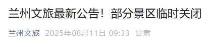 为确保广大游客和市民的生命财产安全,有效防范降雨可能引发的山洪、泥石流、滑坡等次生灾害风险,8月11日0时至8月12日0时,兰州吐鲁沟国家森林公园、榆中栖云田园小镇景区、榆中老家·浪街景区、永登树屏小镇景区临时关闭。请广大游客、市民及时调整游览安排,切勿擅自进入关闭景区或在景区周边危险区域逗留。