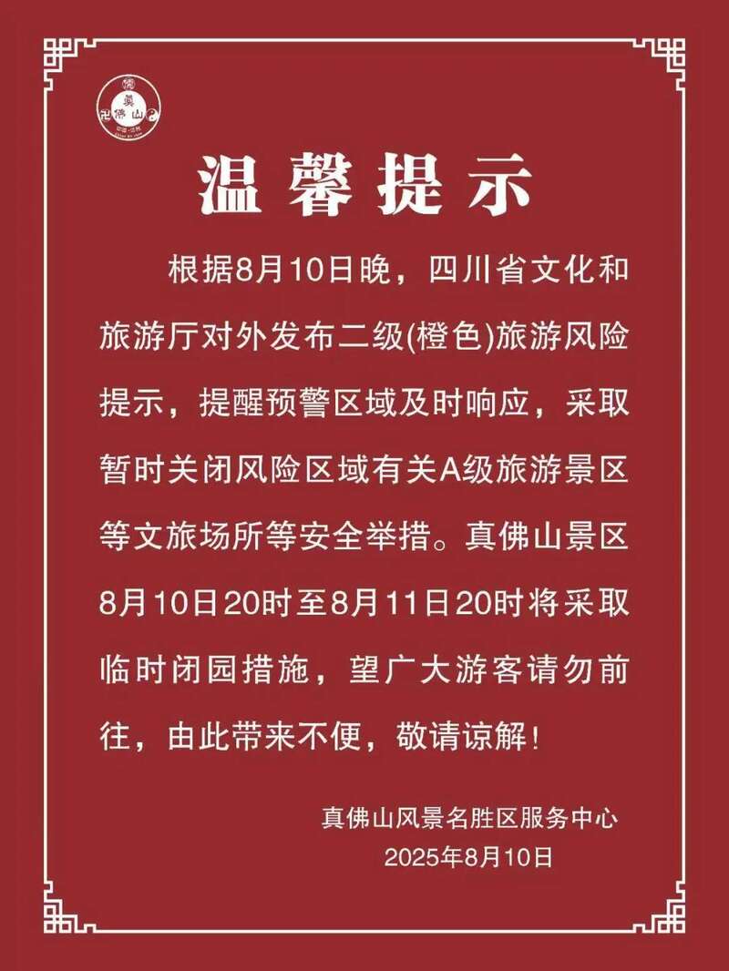 四川省文化和旅游厅8月10日晚发布二级(橙色)旅游风险提示,明确8月10日20时至11日20时,省内12个县(市、区)旅游活动面临较大山洪灾害风险。