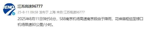 8月11日9时56分,S88南京机场高速南京段由于降雨,花神庙枢纽至禄口机场限速80公里/小时。
