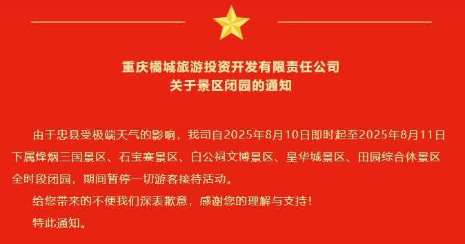 8月10日,重庆橘城旅游投资开发有限责任公司关于景区闭园的通知:由于忠县受极端天气的影响,自8月10日即时起至8月11日,烽烟三国景区、石宝寨景区、白公祠文博景区、皇华城景区、田园综合体景区全时段闭园,期间暂停一切游客接待活动。