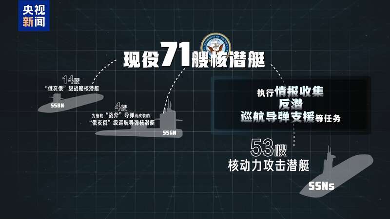 根据非营利组织“核威胁倡议”的数据(Nuclear Threat Initiative),美国海军现役71艘核潜艇,是世界上规模最大的水下舰队,其中包括14艘“俄亥俄”级战略核潜艇(SSBN),每艘最多可携带24枚“三叉戟II”潜射洲际导弹,射程超过12000公里,单枚弹头的爆炸威力达47.5万吨TNT当量,相当于投掷在日本广岛原子弹威力的30倍。4艘是为搭载“战斧”导弹而改装的“俄亥俄”级巡航导弹核潜艇(SSGN),专用于远程打击和特种作战任务,以及53艘核动力攻击潜艇(SSNs),执行情报收集、反潜和巡航导弹支援等任务。