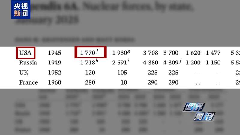 今年1月,瑞典斯德哥尔摩国际和平研究所发布报告显示,截至2025年1月,美国已在数百架轰炸机和导弹上共部署了1770枚核弹头,俄罗斯部署的数量为1718枚。