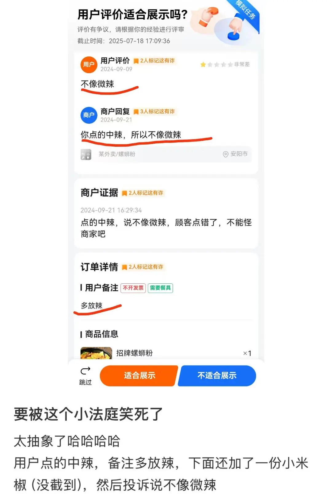 中青报·中青网记者曾关注到,当下,在外卖、二手交易等线上平台,由于买卖双方各执一词,有年轻人化身“赛博判官”(在一些网络平台上受邀评判评论合理性、交易纠纷等的大众评审员——记者注),面对“公说公有理,婆说婆有理”的场面,作出自己的判断。