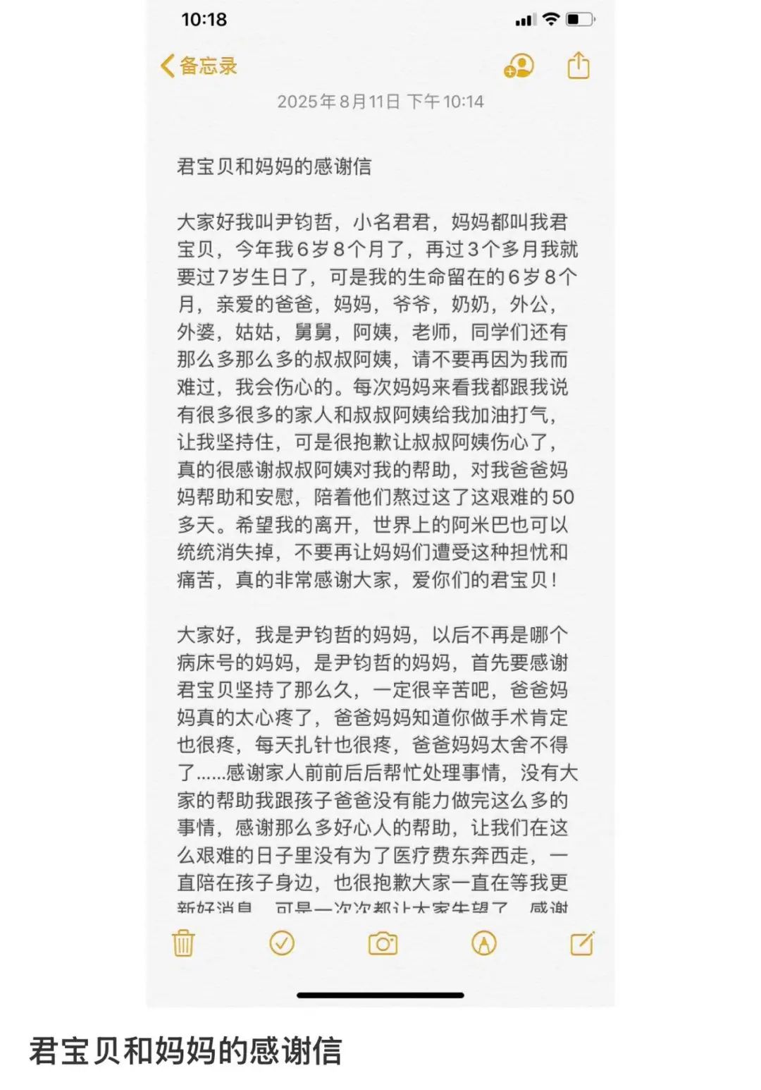 8月11日晚,男孩的妈妈在社交平台发布了一封“君宝贝和妈妈的感谢信”。感谢信称,男孩的生命留在了6岁8个月。