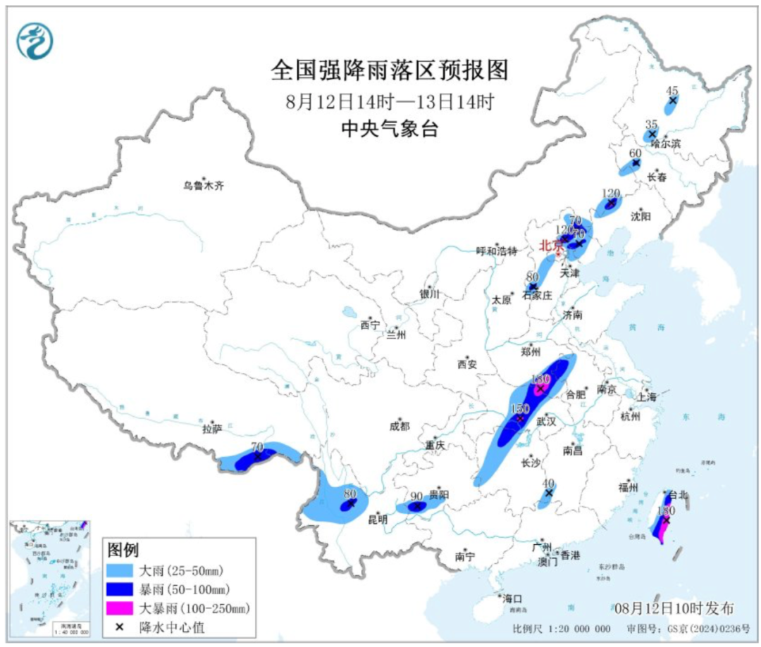 预计,12日14时至13日14时,河北西部和东北部、北京西南部和北部、天津北部、内蒙古东南部、黑龙江中部和西南部、吉林西部、辽宁西部、河南南部、安徽北部、湖北中部、湖南西部和北部、贵州南部、云南中西部、台湾岛大部、西藏南部等地部分地区有大到暴雨。其中,河南南部、湖北中部、台湾岛东部和南部等地部分地区有大暴雨(100~180毫米)。