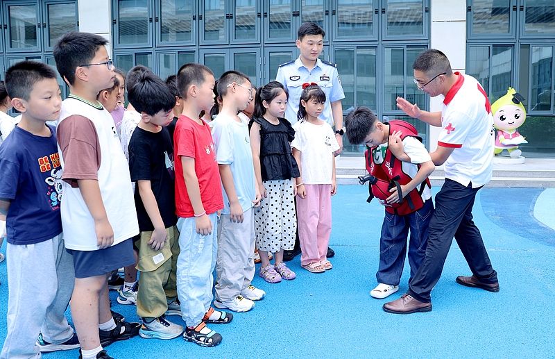 2025年8月12日,江苏省宿迁市公安局宿城分局太湖路派出所民警联合蓝天救援志愿服务队志愿者走进辖区暑托班,向小朋友宣传防溺水知识。