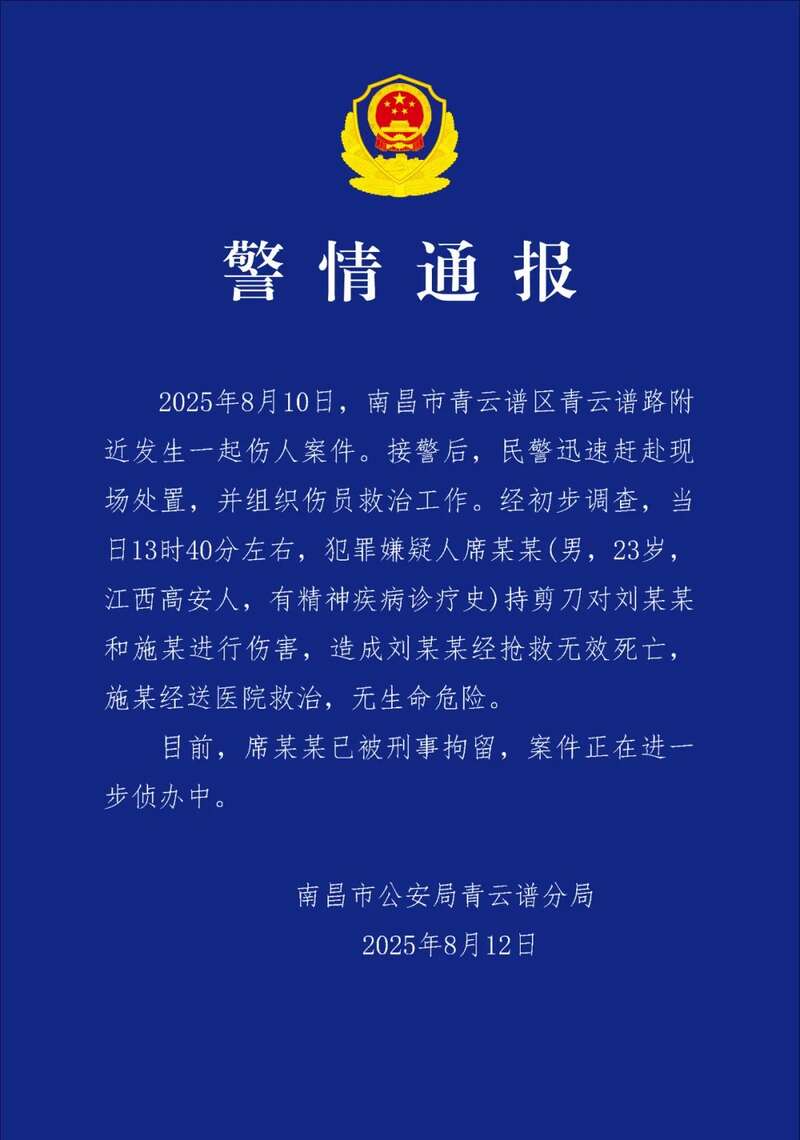 8月10日,南昌市青云谱区青云谱路附近发生一起伤人案件。经初步调查,当日13时40分左右,犯罪嫌疑人席某某(男,23岁,江西高安人,有精神疾病诊疗史)持剪刀对刘某某和施某进行伤害,造成刘某某经抢救无效死亡,施某经送医院救治,无生命危险。