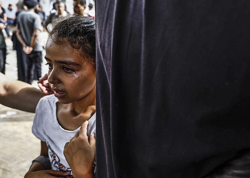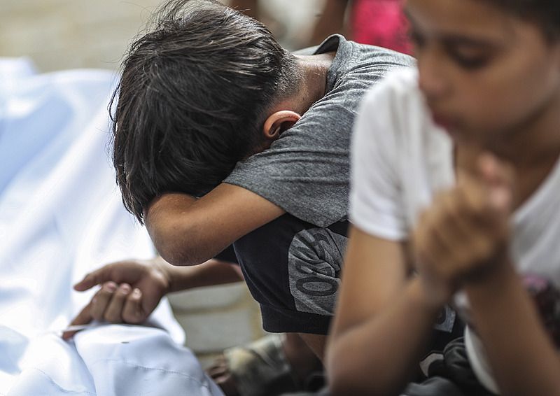 当地时间2025年8月13日,加沙地带代尔拜拉赫,在谢赫里丹社区的公共市场,以色列对等待援助的民众发动袭击,造成巴勒斯坦人死亡。遇难者遗体被运往希法医院进行安葬,亲属们为此哀悼。