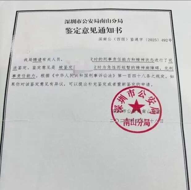 据李黎介绍,投诉后,南山分局对嫌疑人进行了精神鉴定。根据深圳市公安局南山分局4月28日出具的《鉴定意见通知书》显示,对嫌疑人在案发时的刑事责任能力和精神状态进行了司法鉴定。鉴定意见是:被鉴定人在案发时为急性而短暂的精神病障碍,无刑事责任能力。