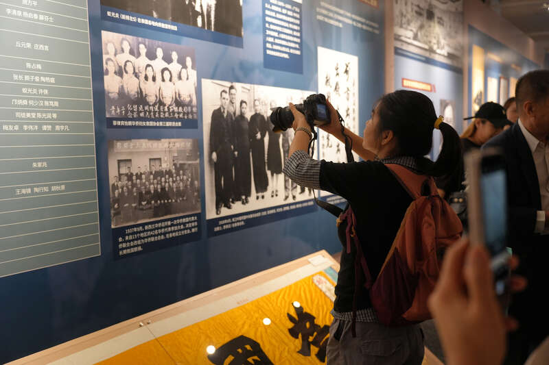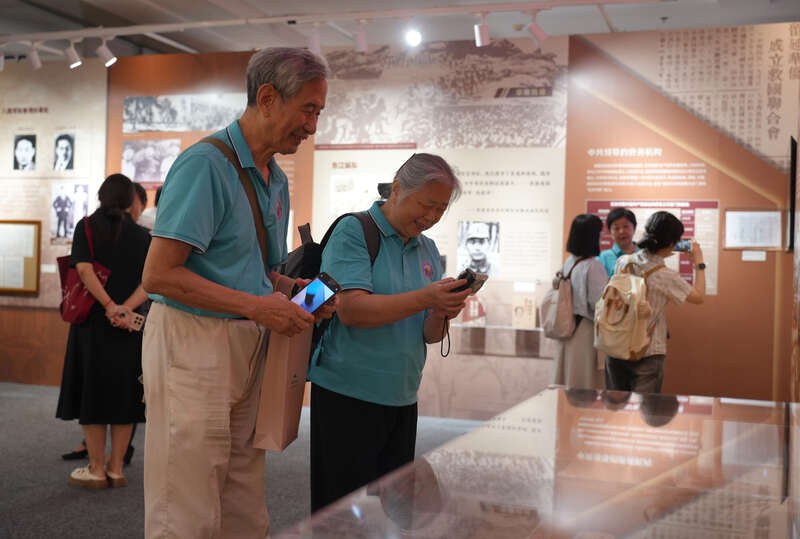 8月14日,北京,中国华侨历史博物馆,75岁的许呈亮女士(右)与同行的“华支”后代一起观展。“华支”即菲律宾华侨抗日游击支队,成立于1942年5月。许呈亮女士将父亲许敬诚(许立)战斗负伤时穿着的血衣、菲律宾华侨抗日游击支队使用的党旗等历史物件捐赠给中国华侨历史博物馆。李媛/摄
