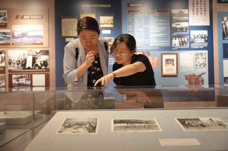 8月14日,北京,中国华侨历史博物馆,越南华侨连贯之女连子(左)同好友王金波观看展览。当日,“万里同心——海外华侨与中国人民抗日战争暨世界反法西斯战争纪念特展”在中国华侨历史博物馆开幕。据了解,该展览在北京、广州、潮州、黑河和德宏等五地同步展出。李媛/摄