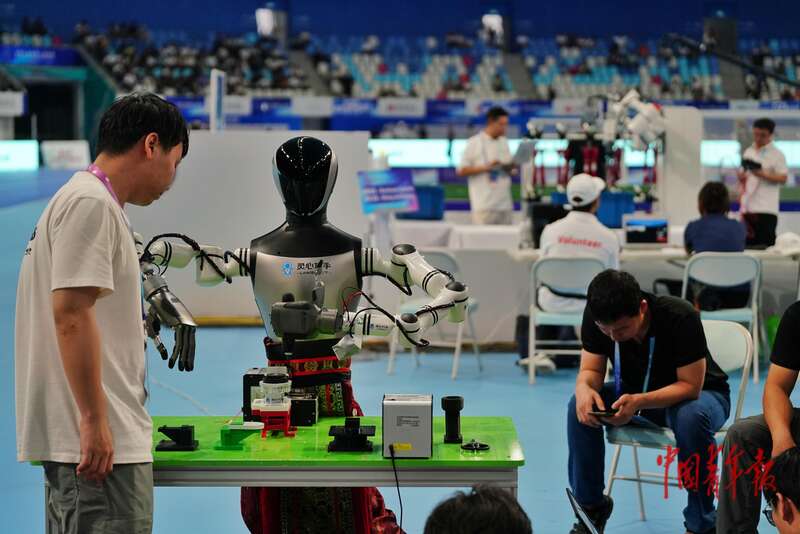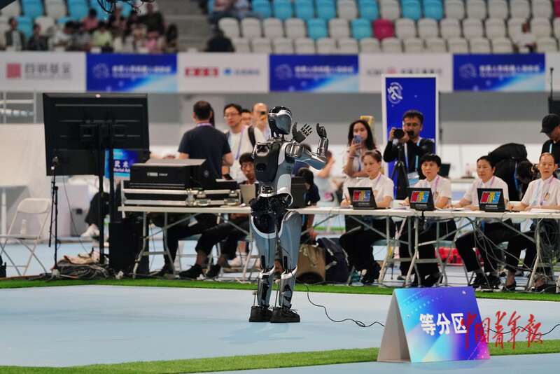 8月15日,北京国家速滑馆“冰丝带”,2025世界人形机器人运动会现场。中青报·中青网记者 赵迪/摄