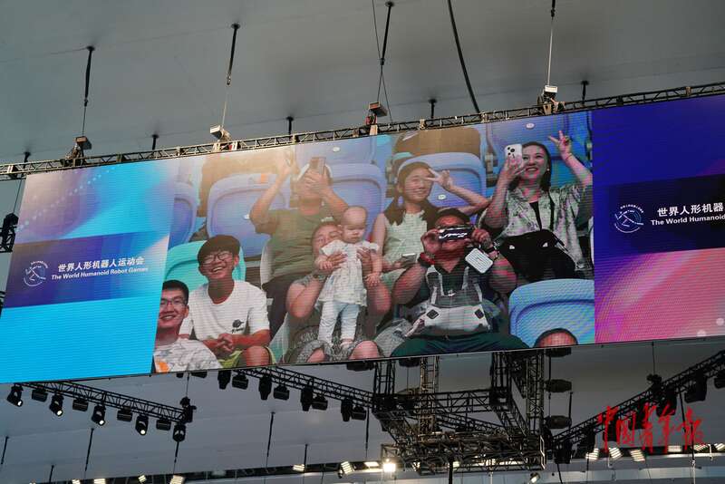 8月15日,北京国家速滑馆“冰丝带”,2025世界人形机器人运动会现场,大屏幕里播放着看台上家长带着孩子观赛的画面。中青报·中青网记者 赵迪/摄