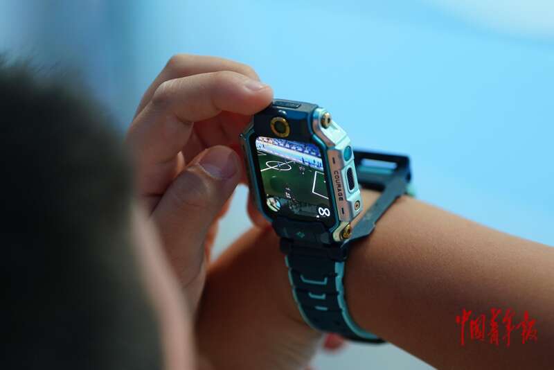 8月15日,北京国家速滑馆“冰丝带”,2025世界人形机器人运动会现场,一位小朋友用智能手表拍摄机器人足球赛。中青报·中青网记者 赵迪/摄