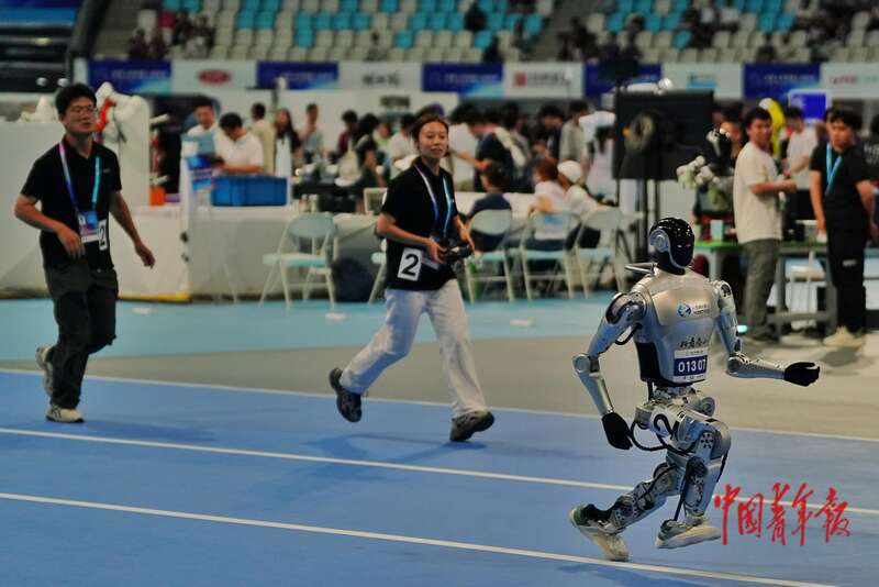 8月15日,北京国家速滑馆“冰丝带”,2025世界人形机器人运动会现场,田径比赛。中青报·中青网记者 赵迪/摄