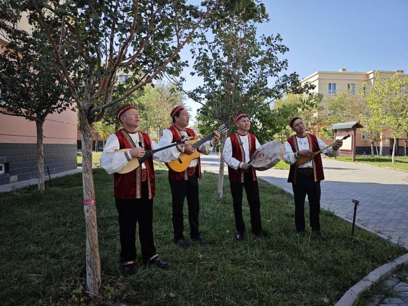 四名表演者来自达尔汗文艺队,他们身着有着浓郁民族特色的传统服饰,情绪饱满地自弹自唱。领队加尔肯别克·纳斯依奥拉怀抱冬不拉,指腹在琴弦上灵活跳跃。有的队员敲击萨满鼓,还有队员弹奏吉他,不同风格的乐器声音交织在一起,配上带着草原特有辽阔感的嗓音,心声随旋律自然流露。
