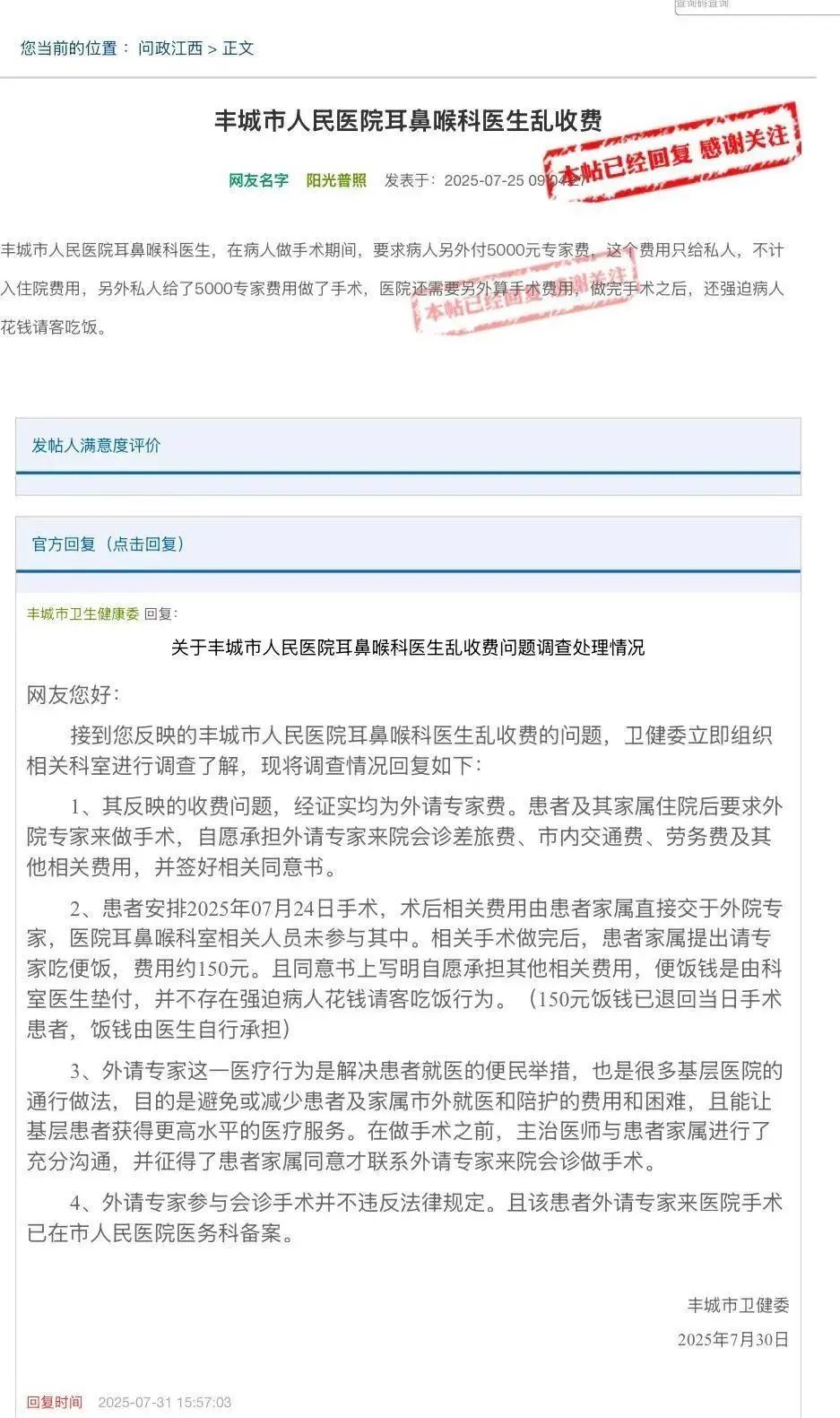 近日,江西省丰城市卫健委在“问政江西”网站针对“丰城市人民医院耳鼻喉科医生乱收费”问题的回应引发关注。7月25日,有网友举报称:“丰城市人民医院耳鼻喉科医生,在病人做手术期间,要求病人另外付5000元专家费,这个费用只给私人,不计入住院费用,另外私人给了5000专家费用做了手术,医院还需要另外算手术费用……”7月30日,丰城市卫健委回应称:患者及其家属要求外院专家做手术,自愿承担相关费用,并签好相关同意书。
