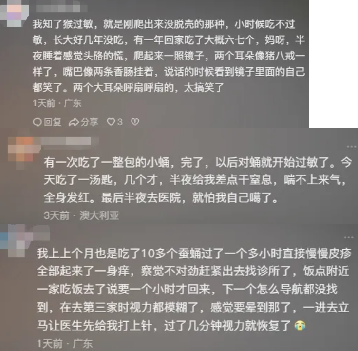 “我吃海鲜、鸡蛋、牛奶都不过敏,没想到这一次吃蚕蛹过敏了!”张先生赶紧服用抗过敏药物,第三天已完全康复。之后,他还去医院检查了过敏原,发现自己属于对异体蛋白过敏人群。