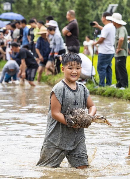 2025年8月16日,贵州从江,人们在刚边壮族乡三联村稻田里参加抓鸭子趣味活动。