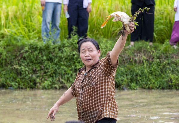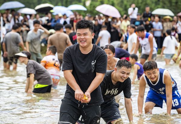 2025年8月16日,贵州省从江县刚边壮族乡三联村,人们在稻田里参加捕鱼趣味活动。