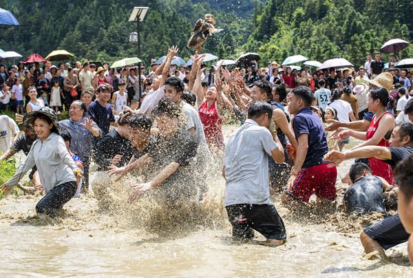 2025年8月16日,贵州从江县刚边壮族乡三联村,人们在稻田里参加抓鸭捕鱼趣味活动。