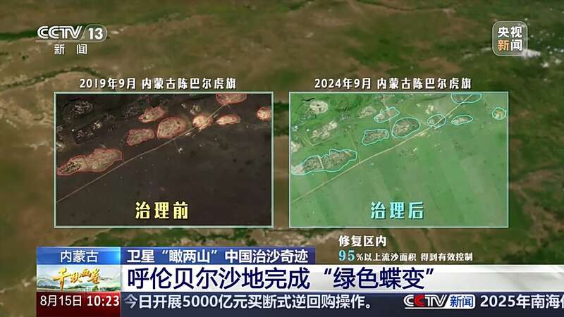 📍内蒙古陈巴尔虎旗,位于四大沙地中最北部的呼伦贝尔沙地。2020年,当地启动退化草原生态修复,现在修复区内95%以上的流沙面积得到有效控制,植被覆盖度提升至85%以上,实现了绿色蝶变。