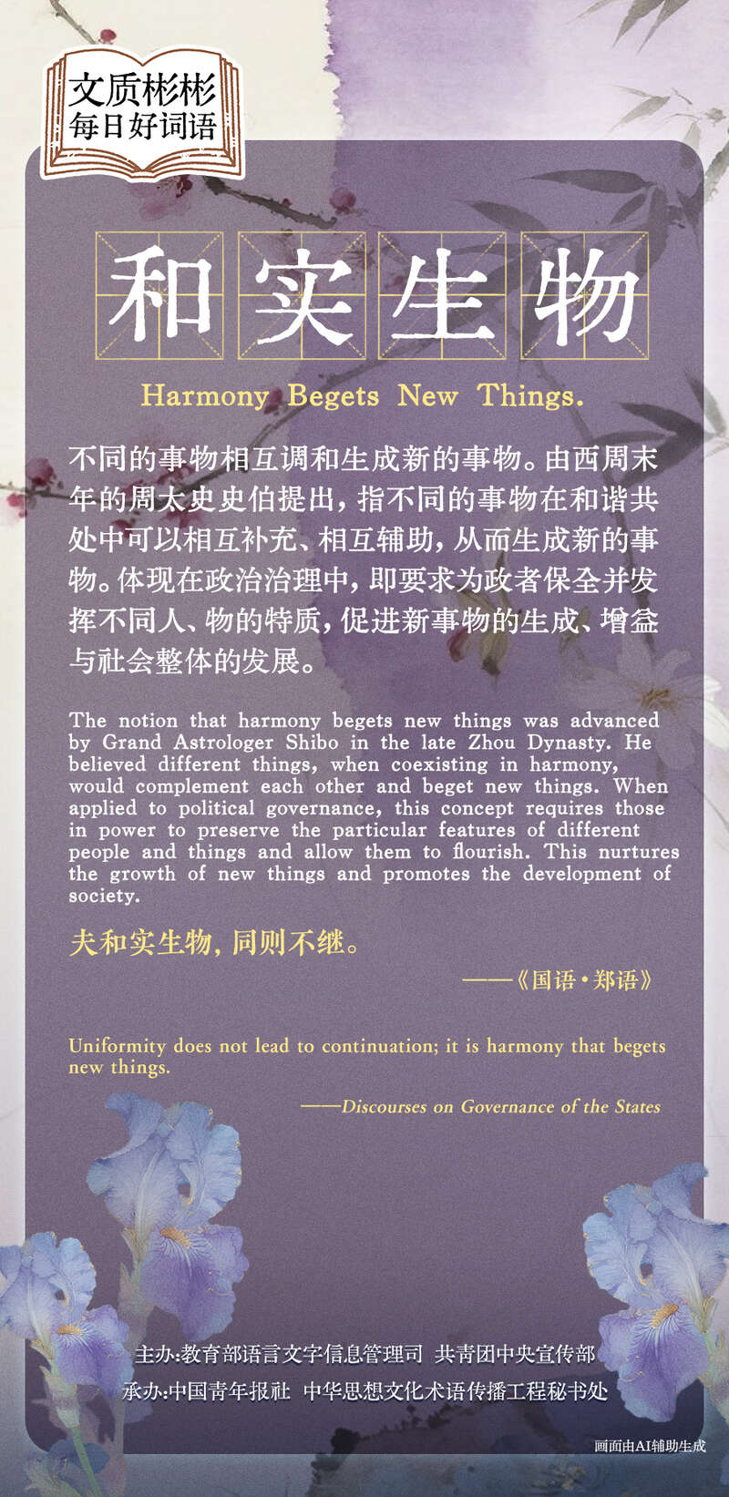 The notion that harmony begets new things was advanced by Grand Astrologer Shibo in the late Zhou Dynasty. He believed different things, when coexisting in harmony, would complement each other and beget new things. When applied to political governance, this concept requires those in power to preserve the particular features of different people and things and allow them to flourish. This nurtures the growth of new things and promotes the development of society.