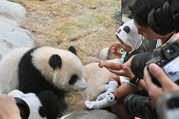 2025年8月15日,香港海洋公园举办“大熊猫龙凤胎盛大生日派对”,庆祝“港产”大熊猫龙凤胎“加加”“得得“一周岁生日。2024年8月15日,“加加”“得得”在香港诞生。图为小孩与大熊猫“加加”互动。 中新社记者 李志华 摄
