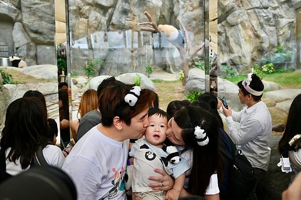 2025年8月15日,香港海洋公园举办“大熊猫龙凤胎盛大生日派对”,庆祝“港产”大熊猫龙凤胎“加加”“得得“一周岁生日。2024年8月15日,“加加”“得得”在香港诞生。图为一对父母亲吻孩子,并与大熊猫“加加”“得得”合影。 中新社记者 李志华 摄