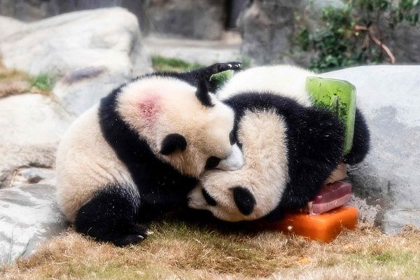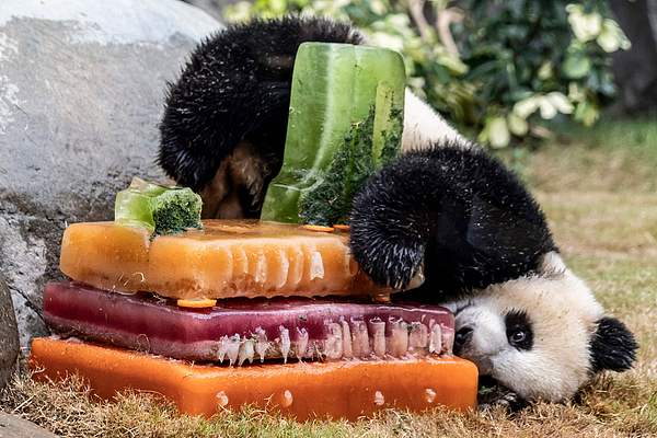 2025年8月15日,香港海洋公园,香港首批本地出生的熊猫幼崽“加加”和“得得”在它们的栖息地享用一周岁生日蛋糕。