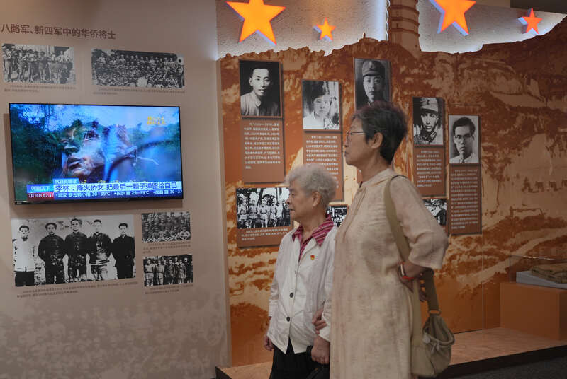 8月14日,北京,中国华侨历史博物馆,越南华侨连贯之女连子(左)同好友王金波观看展览。当日,“万里同心——海外华侨与中国人民抗日战争暨世界反法西斯战争纪念特展”在中国华侨历史博物馆开幕。据了解,该展览在北京、广州、潮州、黑河和德宏等五地同步展出。李媛/摄